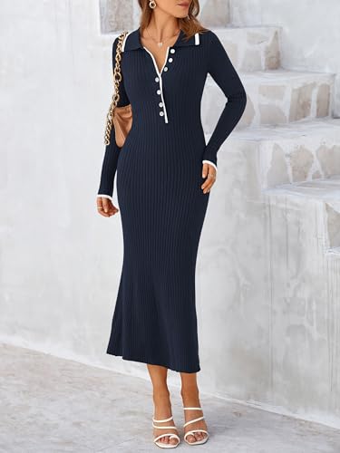 • Features: Long sweater dress,ribbed knit maxi dress,long sleeve bodycon dress,slim fit v neck dress,button up long dress,flares out at the bottom,solid color,maternity sweater dress,long maxi dress,casual sweater dress,fall dresses for women 2024,foldover collar,ankle length,contrast color,comfy and cozy.