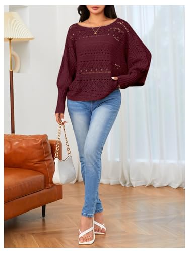 Verdusa Women's Off The Shoulder Sweater Crochet Dolman Sleeve Hollow Out Oversized Boat Neck Long Sleeve Pullovers 7
