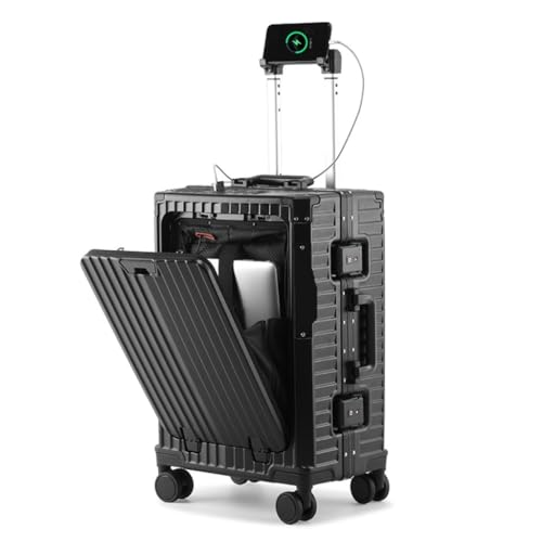 Suitcase Front Opening Multifunctional Suitcase Aluminum Frame Trolley Case Charging Interface Folding Cup Holder Suitcase Tags(White,25in) 7