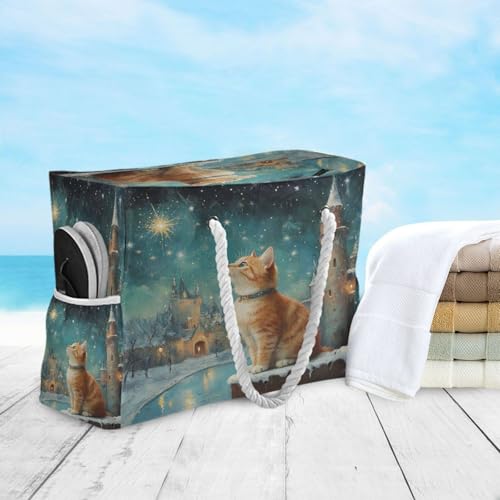 HOT ! Cat and Star Beach Bag & Travel Tote Bag Large Sandproof with Zipper Closure, Wet Pouch for Swim Gym Travel, Lightweight Foldable Outdoor Bag