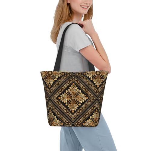 HOT ! Oriental Vintage Damask Pattern - Black And Gold Reusable Zippered Shoulder Bag, Stylish Polyester Tote With Wide Handle & Inner Pocket, Lightweight Durable Shopping & Travel Bag