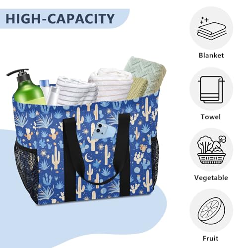 HOT ! linqin Blue Cacti Polka Dot Tote Utility Bag with Handles Foldable Shopping Bags Reusable with Pockets for Travel