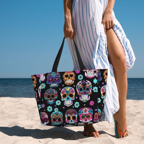 Sugar Skull Large Beach Tote Bag Women Beach Tote Bag For Pool Gym Grocery Travel With Multiple Pocket 6