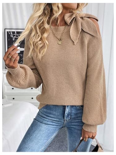 HOT ! MakeMeChic Women's Long Sleeve Sweater Round Neck Cut Out Bow Knot Asymmetrical Knit Tops