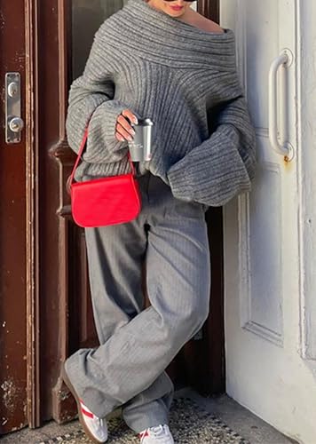 NRTHYE Women Off The Shoulder Sweater Top Long Sleeve Ribbed Knit Chunky Slouchy Asymmetrical Pullover Sweaters 1