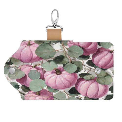Pink Pumpkins And Eucalyptus Leaves Key Holder Bag PU Leather ID Card Holder Keychains Case Cover for Men Women 1