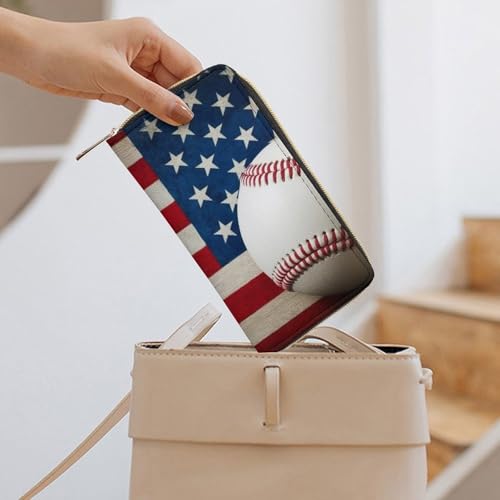 HOT ! Printed Leather Wallet for Men Women, Portable Baseball Rustic Wooden American Flag Wallets with Large Capacity Multiple Card Slots