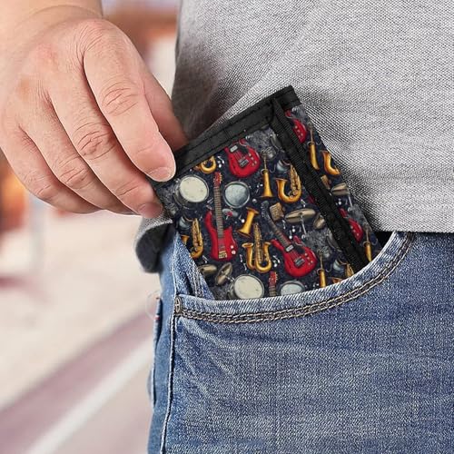 • Design: Featuring a versatile trifold design, this men's wallet includes a front zipper compartment for quick access to essentials. Inside, there are spaces dedicated for ID cards, cards, and changes. The inclusion of a keychain allows you to carry your keys effortlessly, making it a Retro Rock Instruments Print simple wallet for men that's all about practicality