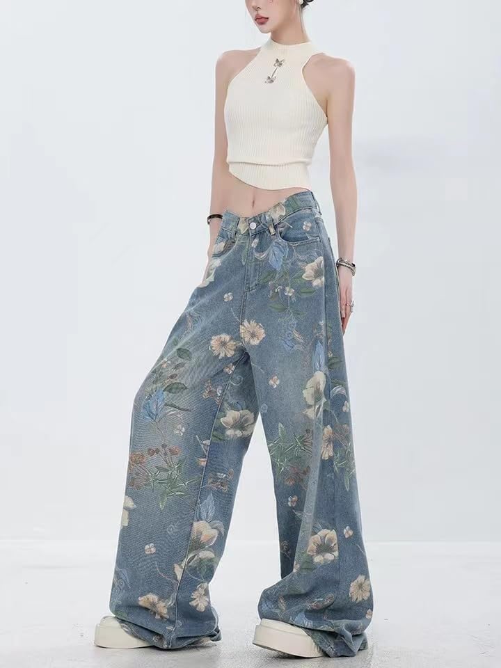 HOT ! Unisex Flower Print Baggy Jeans Vintage Cowboy Harajuku Wide Leg Trashy Grunge Y2k Hip Hop Loose Fit Streetwear