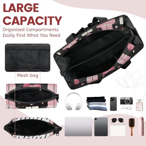 More information about Custom Heart Shape Travel Duffle Bags for Women Weekender Overnight Black Pink Carry on Tote for Airplanes Business Hospital Gym with Toiletry Bag 3Pcs Set