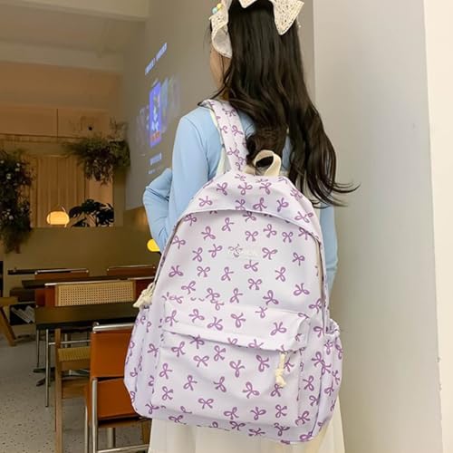 HOT ! Classic Cute Bow Tie Printed Backpack 16.9 Inch Kawaii Casual Simple Lightweight Travel Bag For Women Purple