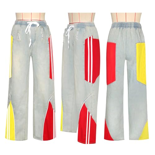 • Drawstring Jeans Women: Baggy jeans for woman, striped pants features elastic high waisted, straight wide leg, basic 4 pockets, ripped details, color block design add a trendy element to this denim jeans for women, streetwear women