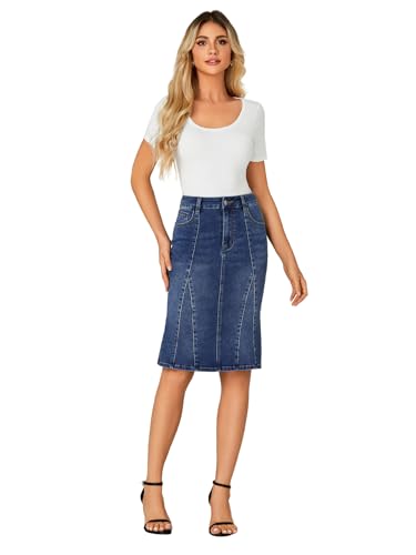 • Features: Denim skirts for women featuring high stretch, high waist, zip fly, button closure, front and back pockets, knee length jean skirts for women and girls.