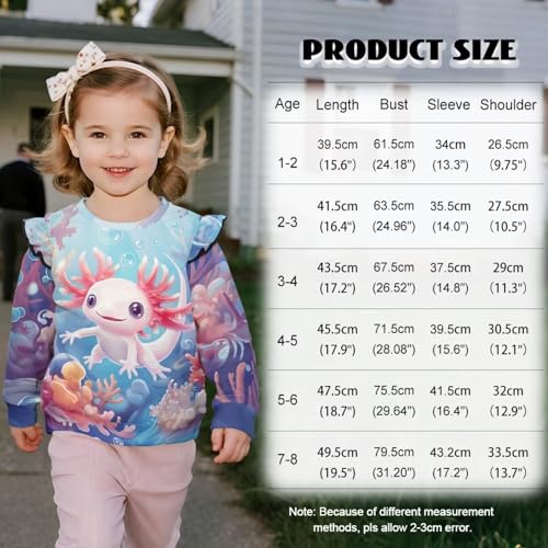 • Fashionable Sweatshirt:This toddler girls' sweatshirt features a round neckline and ruffled long sleeves, printed with a variety of fashionable patterns. The trendy colors add a touch of liveliness to your child's wardrobe. The unique design will make your child stand out from the crowd