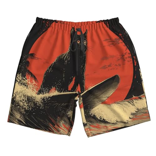 Men Swim Trunks Beach Shorts Swimwear Summer Bathing Suits - Cat Surf Retro Art 5