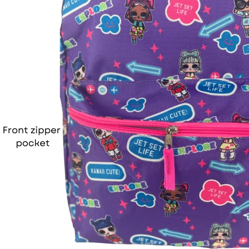 • 16 INCH LOL BACKPACK- The roomy main compartment fits folders, binders, notebooks, & a lunch box. The front features a colorful bright purple, pink and blue print with LOL dolls exploring.