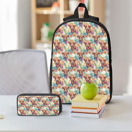 HOT ! Floral Highland Cow 17 Inch Backpack Sets Lunch Bag Lightweight Daypack for Men Women 3Pcs