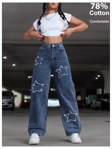 • Features: Streetwear jeans for women, star patched, high waist, straight leg, pocket