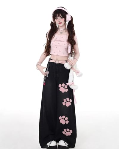 More information about Y2k Kawaii Cat Paw Embroidery Wide Leg Jeans Vintage Hiphop Streetwear Preppy Sweet Loose Fit Casual Denim Pants