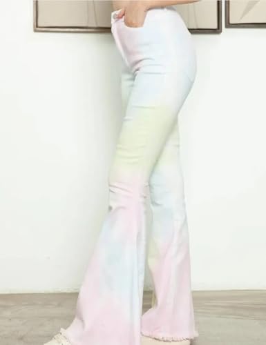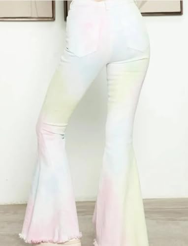 HOT ! Dreamy Pastel Tie-Dye Bell Bottom Jeans – High-Waisted Super Flare with Raw Hem | Retro Stretchy Festival Denim