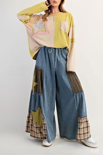 • Design: Elastic closure, high waistband with bow tie detail, pleated and flowy, cute flare leg ruffle pants silhouette, chic floral, gingham and plaid printed patterns, star shaped appliqued patchwork pants, loose jeans for women, boyfriend, 2 side pockets