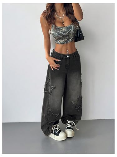 WDIRARA Women's Star Baggy Jeans Raw Trim Wide Leg Denim Pants Grunge Punk Streetwear 1
