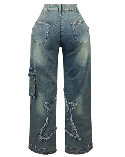 Women's Cargo Jeans Mid Rise Loose Fit Star Patchwork Raw Edge Straight Leg Denim Pants 4