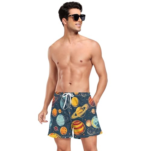 HOT ! xigua Cartoon Planets Mens Swim Trunks with Liner, 5 inch Quick Dry Mens Boardshorts for Beach