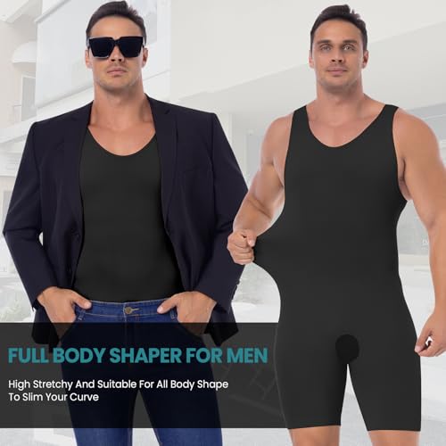 • MENS BODYSUIT SHAPE YOUR BODY: This mens shapewear bodysuit and body shaper slimmer that targets problem areas on the abdomen, chest, back and legs with high compression fabric, smooth your "man boobs" and beer belly, tighten your thighs, and flatten your bulges.