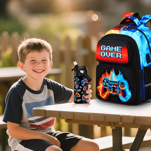 Bevalsa Kids Backpack for Boys with 14oz Insulated Bottle, School Bags for Kids & BPA-FREE Stainless Steel Metal Bottle with Straw Lid for Elementary Middle School Student (Flame) 6