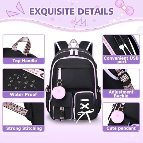 Backpack for Girls Women College Laptop Backpacks Girl Cute School Bag Kids Bookbag with USB Charging Port College Middle High Elementary School Backpack for Teen Girls Travel Daypack (Black) 5