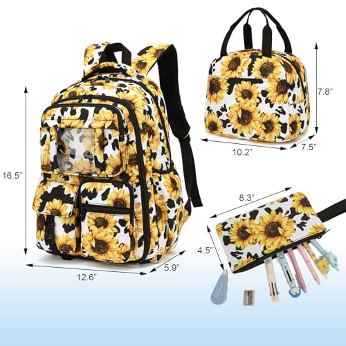 Sunflower Cow Print School Backpack for Girls, 3Pcs Kids Bookbag Set School Bags Back Pack with Lunch Box and Pencil Bag 3