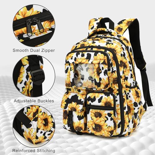 Sunflower Cow Print School Backpack for Girls, 3Pcs Kids Bookbag Set School Bags Back Pack with Lunch Box and Pencil Bag 5