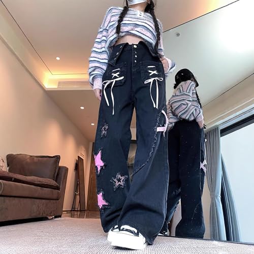 • Incorporating punk elements and functional pockets, these women’s cargo jeans provide both style and practicality. THE PERFECT BLEND OF GOTH & RETRO STREETWEAR,From their distinctive star embroidery to their pink streamer detailing, these pants offer a fresh, modern take on classic goth and retro styles. Perfect for fans of harajuku and y2k aesthetics.