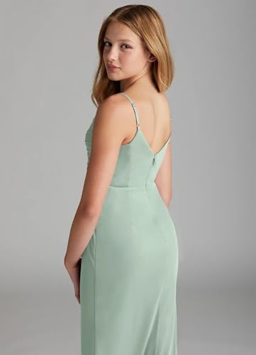 • UJR003 is a stunning junior bridesmaid dress cut from chiffon. She features a front cowl neck and a V-back with adjustable spaghetti straps. The pleated mermaid skirt comes with a leg slit and back darts for a perfect fit. This juniors bridesmaid dress is available in full size range (6-18) and custom sizing.