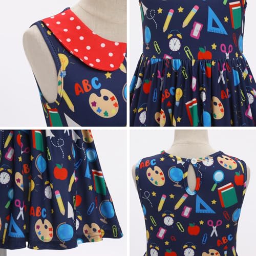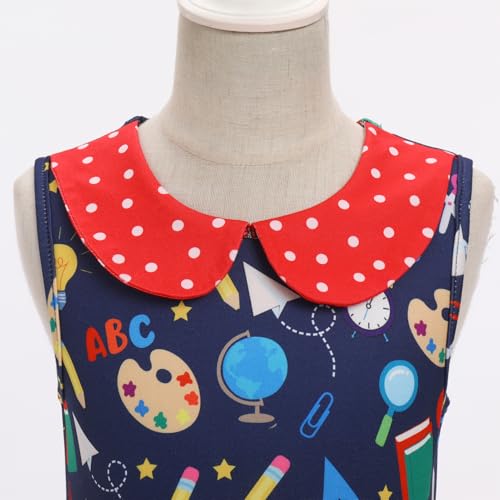 • TRENDY DESIGN - The back to school sleeveless round neck ruffle dress for girls. Contrasting collar adds a striking and eye-catchy effect. Keyhole cutout with button-loop closure. Printed with pencils, schoolbags, books, clock, eraser, scissors, apples, school bus and so on, the dress fully display a wonderful school life, reminding your girl of her school and getting ready for it. Great to match with a pair of sandals to complete the full look