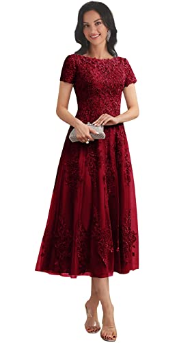 Women's Lace Applique Mother of The Bride Dresses for Wedding with Sleeves Tea Length Tulle Formal Gown 6