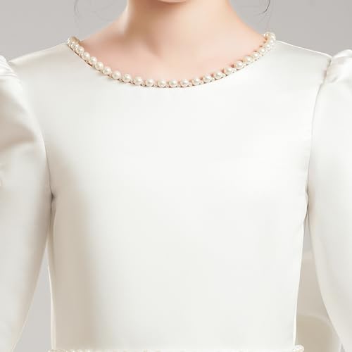 Satin Flower Girl Dress Long Sleeve A-Line Elegant Pageant Dresses Kids Pearls Prom Party Gown with Bow-Knot 5