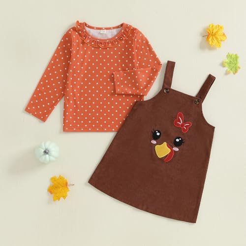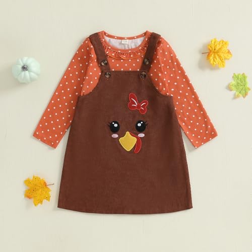 3-7T Toddler Thanksgiving Outfit Girl Long Sleeve Ruffles Shirts and Turkey Suspender Skirt Girls Fall Dress 6
