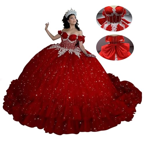 • Features:Sparkly lace tulle quinceanera dresses with ruffles Train; beaded sweet 16 dresses with Bow; layered prom dresses long ball gowns, off shoulder quince dresses puffy, appliques xv dresses for quinceanera; vestido de 15