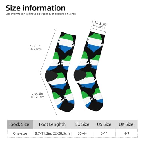 • Product Performance: This Flag Map of Sierra Leone Socks Made Of High Quality Polyester Fiber, Skin-Friendly And Comfortable, Moisture Wicking And Breathable, Not Easy To Pill. Good Elasticity, Complements Your Shoes And Clothes, Brings You An Overall Sense Of Fashion, And Can Be Reused For A Long Time.