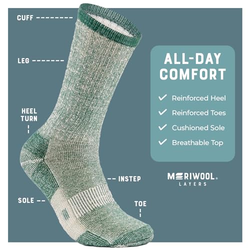 • DURABLE HIKING SOCKS: Push your limits without concern in MERIWOOL's durable hiking socks. Crafted from a robust merino wool blend of 52%wool, 23%acrylic, 12%nylon and 13%elastic, these socks are designed to withstand the rigors of daily wear, whether you’re exploring the great outdoors, working, traveling or just lounging around the house, these socks are built to go the distance. Say goodbye to holes and hello to your new favorite socks, engineered for endurance and comfort.