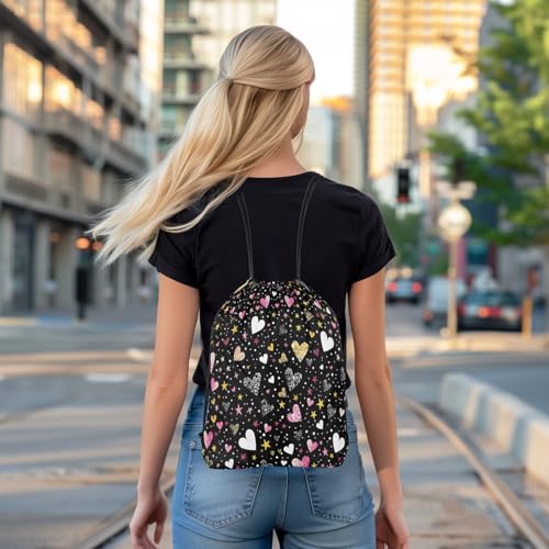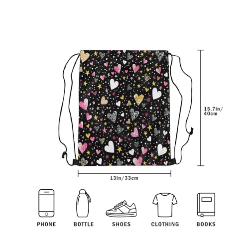 Feelyou Hearts Backpack 13"x15.7" for Love Hearts Drawstring Backpack Glitter Sparkle Hearts Backpack Black Golden Drawstring Backpack for All Season Waterproof Cinch Bag 5
