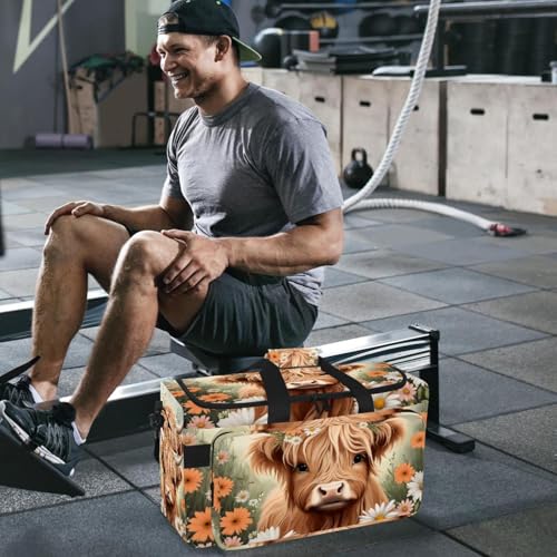 Travel Duffel Bags for Men and Women, Waterproof Weekender Overnight Gym Bags, Highland Cow Daisies 1