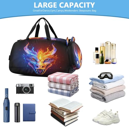HOT ! Gym Travel Duffle Bag for Boys Girls Fire Water Dragon Sports Dance Bag with Shoe Compartment & Wet Pocket Football Kids Travel Bag Teens Sleepover Carry