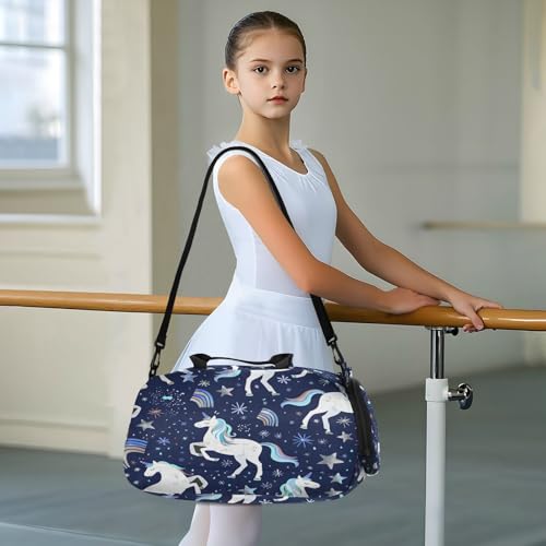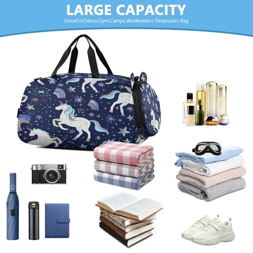 HOT ! Gym Travel Duffle Bag for Boys Girls Repeating White Unicorns Rainbows Pattern Sports Dance Bag with Shoe Compartment & Wet Pocket Football Kids Travel Bag Teens Sleepover Carry