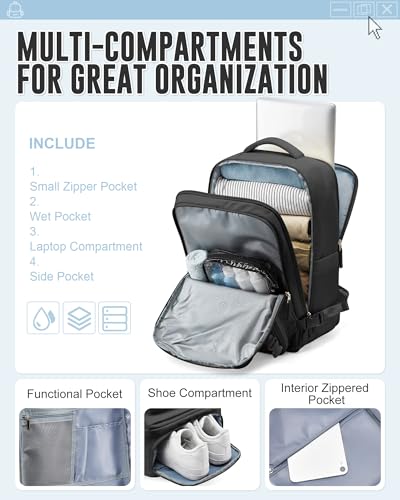 • Separate Shoes Compartment & Wet/Dry Pocket: There is a shoe compartment at the bottom of the backpack to separate shoes from other items and keep them clean. The shoe compartment features 2 breathable vents, preventing odors and keeping clothes fresh by separating shoes from other items. The front wet pocket of the travel backpack is made of high-density waterproof material, which can help you separate dry items from wet items such as wet clothes or towels.