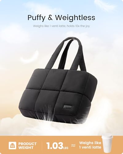 • 【Light & Tough】This puffy tote bag weighs just 1.03 pounds, lighter than an iPad. Made with waterproof outer fabric and soft puffy lining to keep your belongings dry and comfortable. The durable polyester interior resists tearing. Simply toss it in the washing machine for easy cleaning.