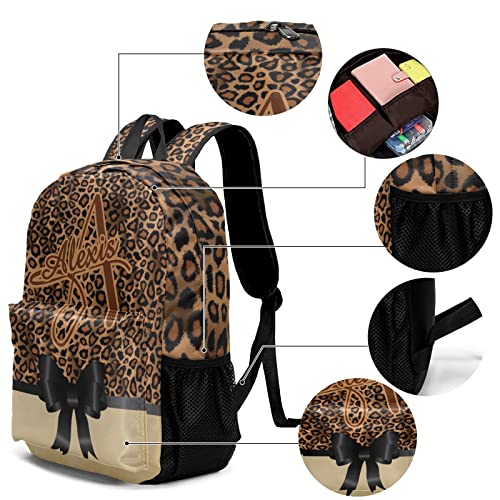 Customized Leopard Print Brown Bow Backpacks Set with Name Multifunctional Series Pack 1Casual Pack +1Lunch Handbag +1Pencil Case 1
