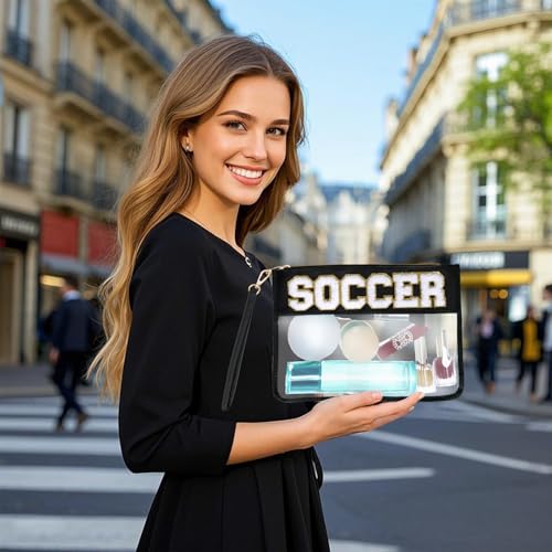 Chenille Letter Bag, Clear Nylon Cosmetic Makeup Bag with Zipper, Varsity Preppy Patch Flat Travel Pouch for Women Girls Gift (Black-SOCCER) 1